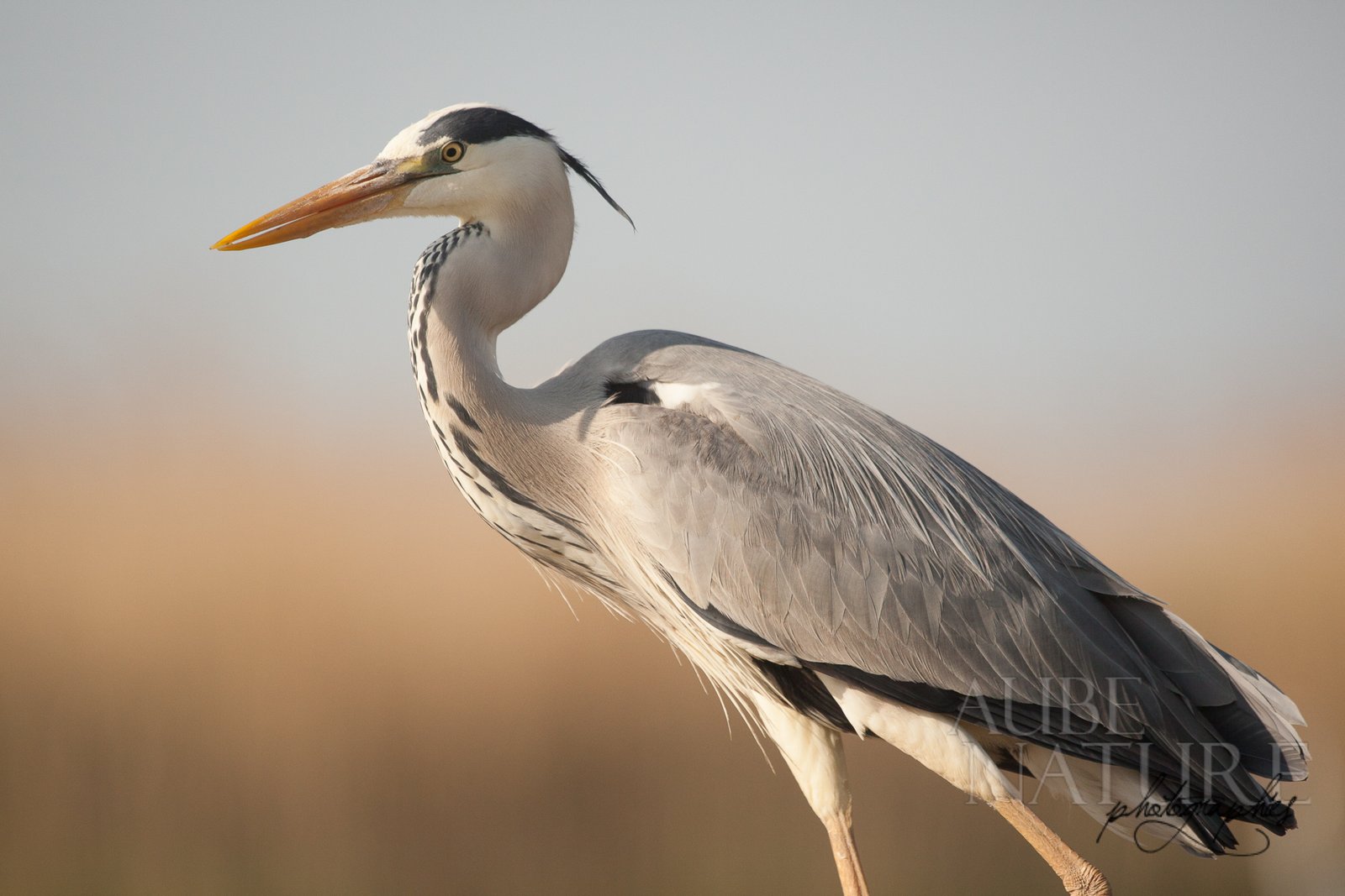 Le héron cendré (Ardea cinerea) est un oiseau imposant que l’on retrouve couramment dans les zones humides de France et d’Europe. Mesurant près d’un mètre de hauteur, il est facilement identifiable grâce à son long cou sinueux, son bec pointu jaune orangé, et ses longues pattes fines adaptées à la pêche dans les eaux peu profondes. Sa silhouette élancée et ses mouvements lents lui confèrent une allure presque sculpturale.