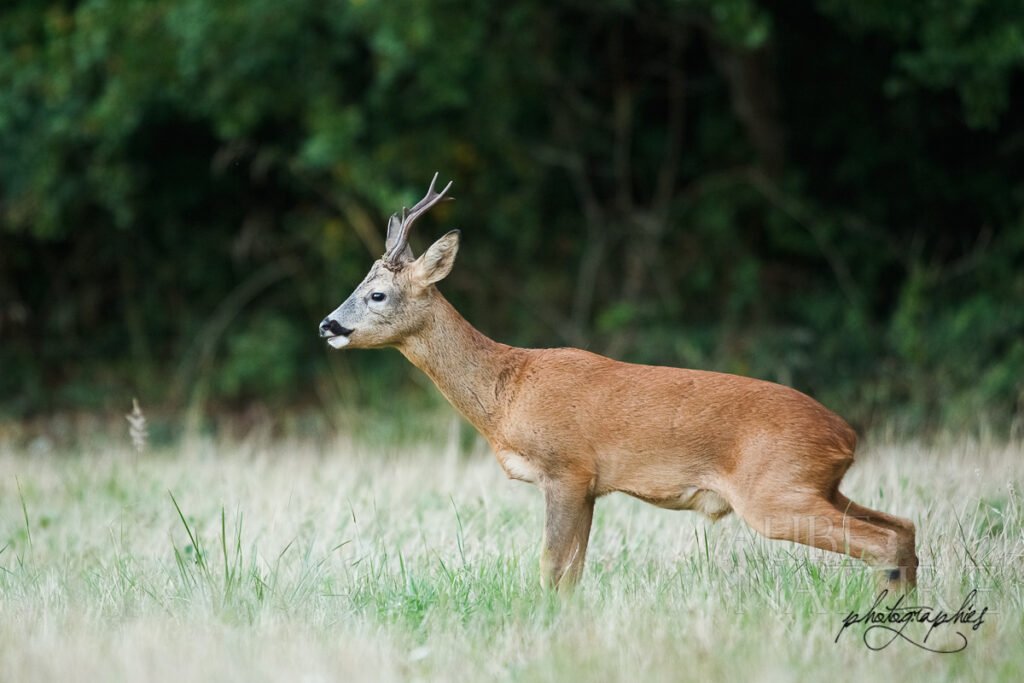 C’est après plusieurs soirs à passer en voiture à proximité d’une petite clairière jouxtant un bois et des champs que je connais très bien pour les avoir arpenté de nombreuses fois, que je me suis décidé à venir affûter… Chaque soir ou presque, un ou plusieurs chevreuils venaient au gagnage sur cette étendue herbeuse, malheureusement ombragée en soirée. Mais cela constituait un joli challenge car la promiscuité des animaux serait de toute évidence assez forte !